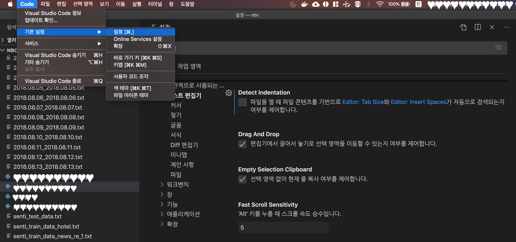 방법은 아래 이미지와 같이 메뉴-> Code -> 기본설정 -> 설정 을 클릭하면 오른쪽에 설정 메뉴와 내용을 볼 수 있다.