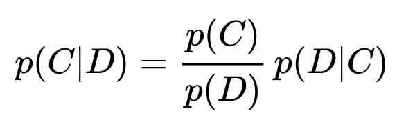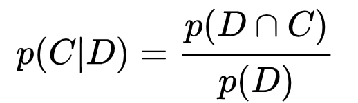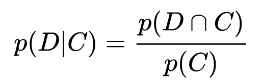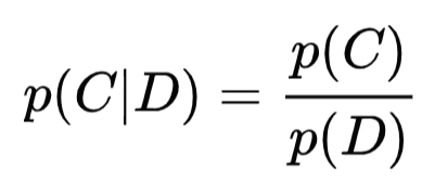 [공식6]을 이용해서 공식 5의 오른 쪽 분자에 있는 p(D ∩ C)를 p(C) p(D|C) 로 아래와 같이 바꿀 수 있다.