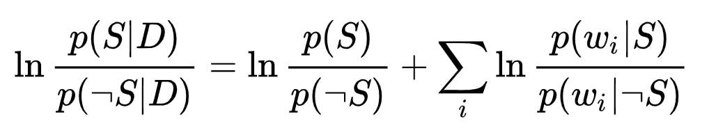 이렇게 계산하면 두 클래스간의 유서도비(우도비)율이 나오는데, 문제는 클래스에 속한 단어의 숫자가 일치하지 않고 발생 차이가 많이 날 수 있기 때문에 (예: 스팸단어 1,000개, 일반단어 100,000개) 로그를 취해서 크기/스케일을 맞추어 준다.