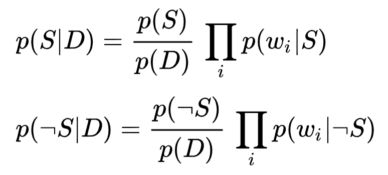 그래서 간단하게 스펨과 일반 두가지의 클래스만 있다고 가정하고 위 공식의 C를 스팸(S)과 일반(-S)로 바꾸면 아래와 같다.