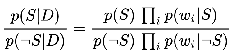 결국 스팸 가능성이 더 큰지, 아니면 일반일 가능성이 더 큰지를 비교하면 되므로 계산해서 나온 두 값을 비율로 만들어서 어느 것이 더 높은지 판단 할 수 있다. 이를 위해 위의 공식 2개를 비율로 만들면 아래와 같다. 같은 항의 값으로 나눈 것이다.