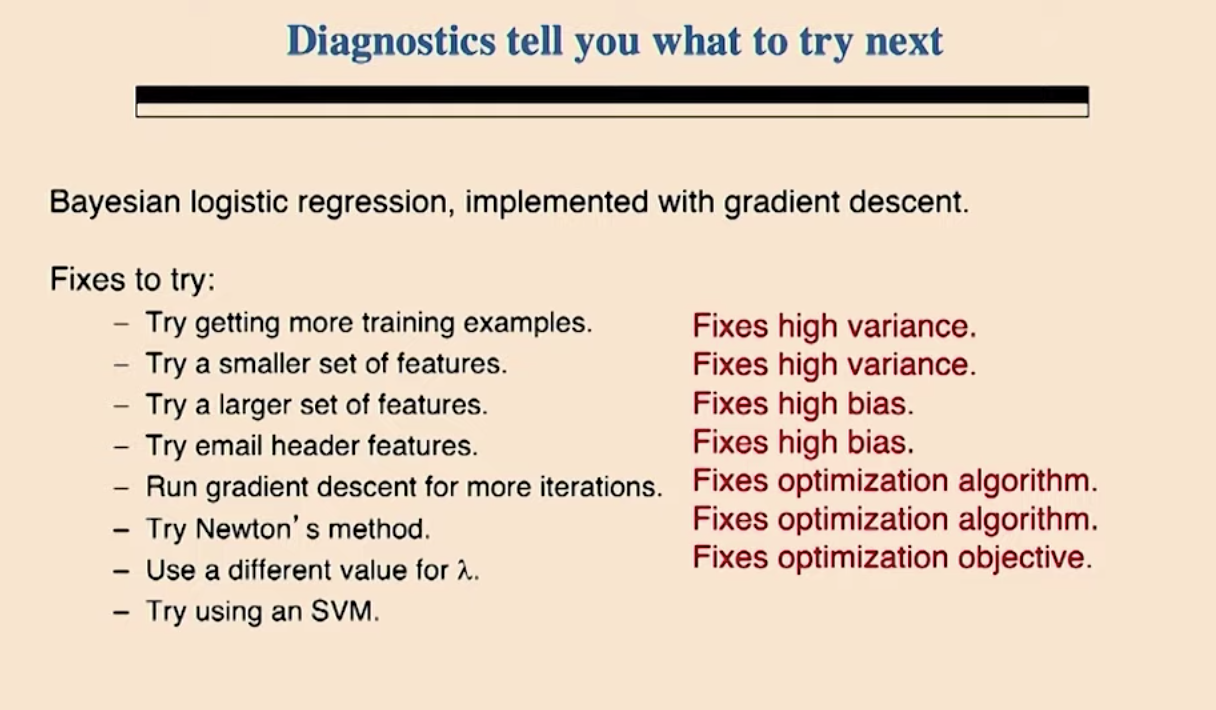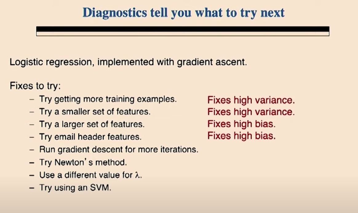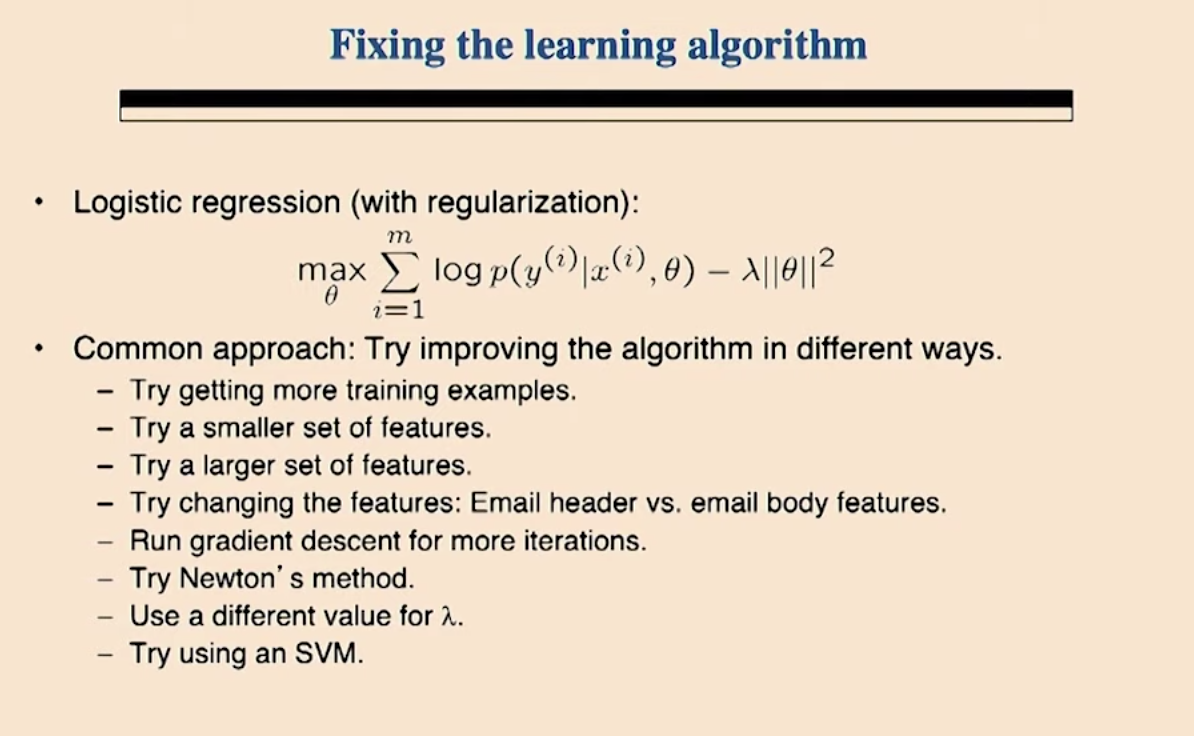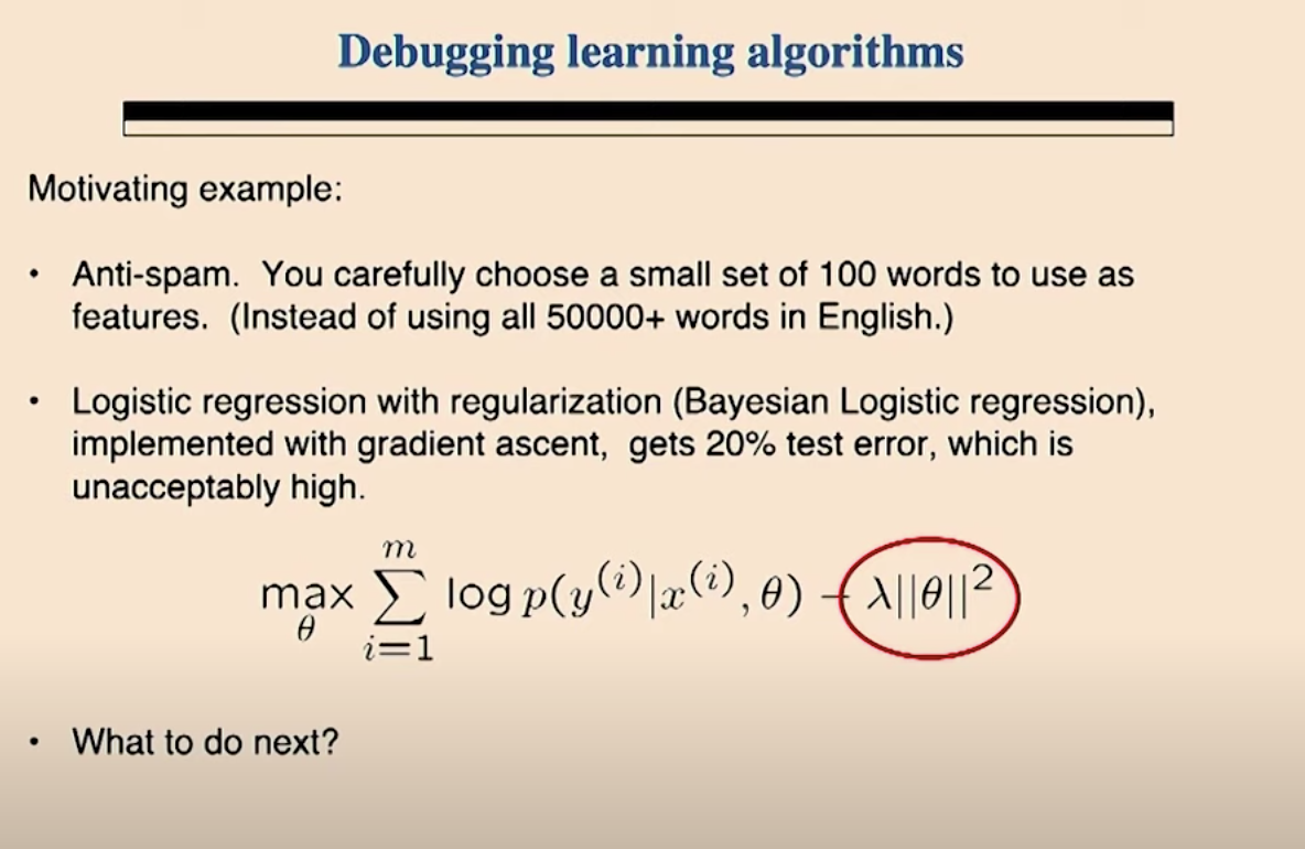스팸 메일을 막기위한 Anti-spam 모델을 만든다고 가정해 보겠습니다. 모든 영어 단어를 피처로 이용하는 대신에 100개의 단어를 피처로 골랐습니다. 로지스틱 회귀와 경사 상향법을 가지고 모델을 구현하였습니다. 그래서 20%의 테스트 에러가 발생했는데 이것은 쓸수 있는 수준이 아닙니다. 자 이런 상황에서 여러분이라면 무엇을 하시겠습니까?