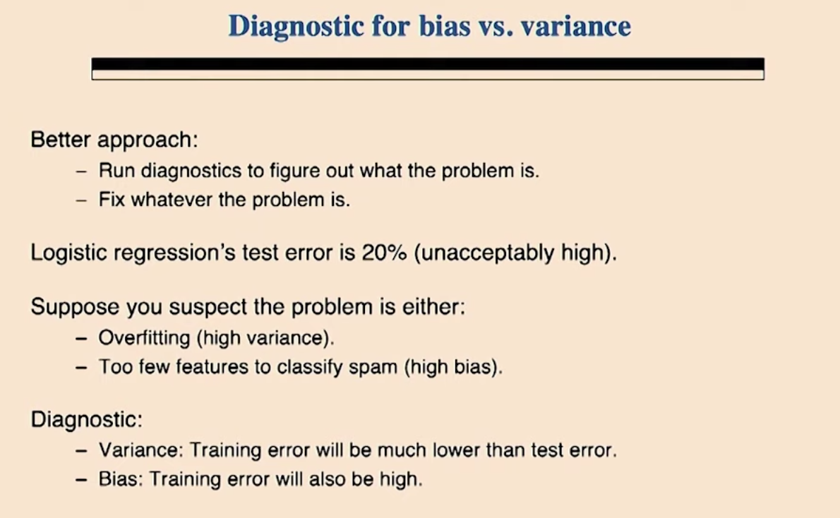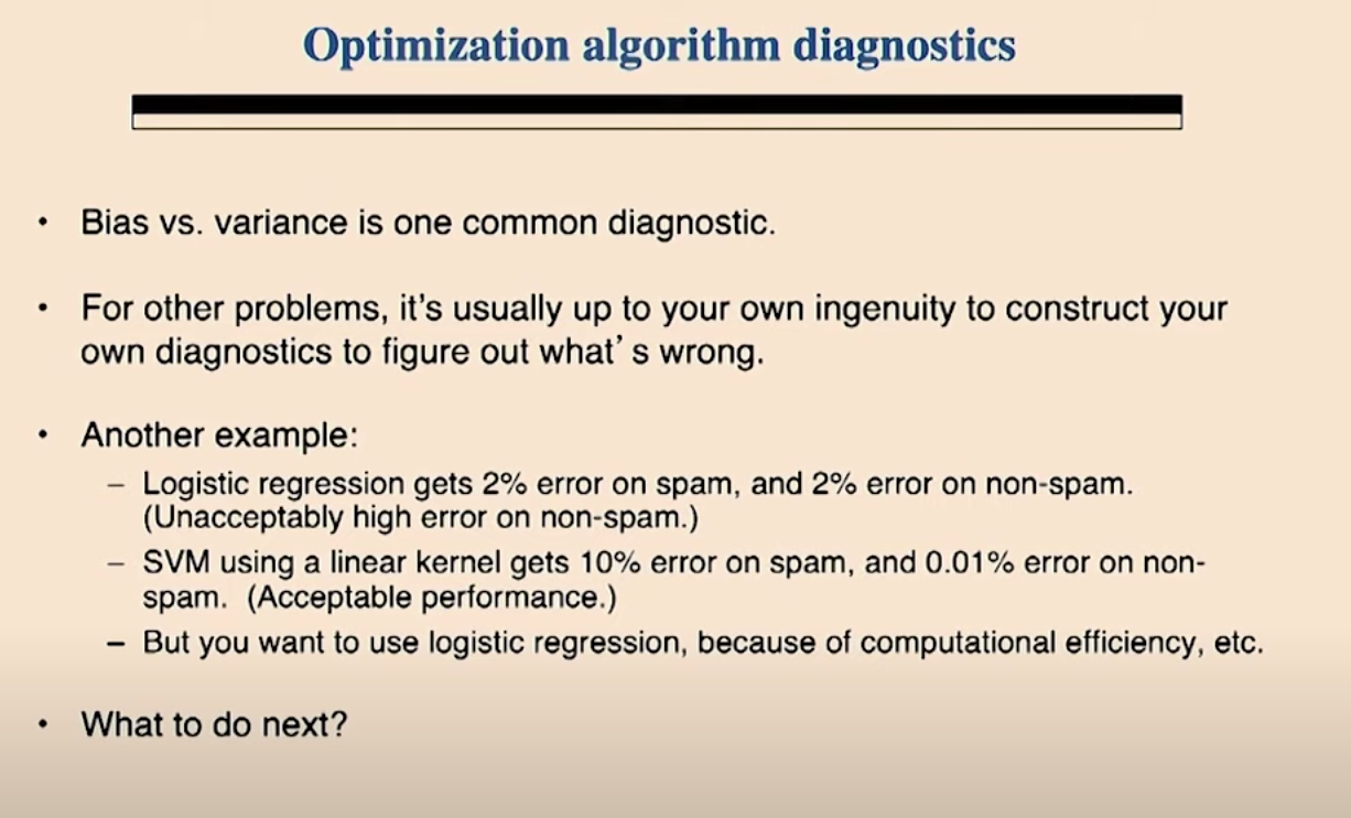 앞서 살펴본 Bias / Variance 문제가 가장 흔하고 가장 중요한 진단 방법입니다. 그밖의 다른 문제에 대해서는 무엇이 잘못된 것인지를 알아내기 위한 당신의 진당방법을 만들기위한 당신의 창의성에 달려있습니다. 다른 예를 들어 보겠습니다. 로지스틱 회귀 모델을 통해 스팸 메일에 대해 2%의 에러율과 정상 메일에 대해 2%의 에러율을 얻었다고 합시다. 실제로 사용하기 어려운/받아들이기 힘든 수준입니다. 또 다른 성형 커널 기반의 SVM 모델을 이용해서 스팸 메일에 대해서 10%의 에러율을, 정상 메일에 대해서 0.01%의 에러율을 얻었습니다. 이정도 성능은 받아들일만 하다고 하겠습니다. 그런데 당신은 계산의 효율성을 위해서 로지스틱 회귀 모델을 사용하기를 원합니다. 어떻게 해야할 까요?