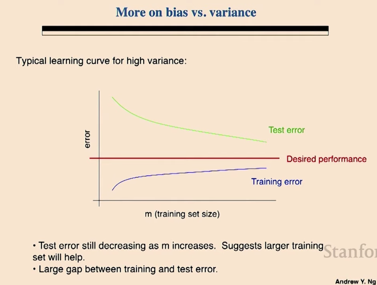 높은 variance를 가지는 모델의 에러와 데이터 량을 그래프로 그려보면 아래와 같습니다. 데이터 수가 많아져도 훈련 에러율과 테스트 에러율의 차이가 계속 발생하고, 훈련 때는 원하는 에러율보다 낮지만 테스트 할때는 높습니다. 그리고 테스트에서는 원하는 목표 에러율보다 낮아지지 않습니다. 목표에러와 테스트 에러의 차이가 많이 난다는 의미입니다. 데이터(m)가 늘어 남에 따라서 테스트 에러율이 낮아지고 있으므로 더 많은 데이터가 도움이 될 것 입니다. 그럼에도 불구하고 훈련 에러율과 테스트 에러율 사이에 차이가 있습니다. 높은 Variance가 있을 경우 아래와 같은 그래프를 보입니다.