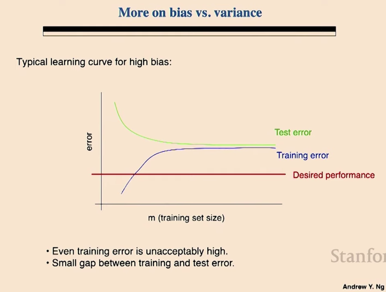 다음은 높은 bias를 가진 러닝 커브의 예를 들어 보겠습니다. 높은 바이어스가 있는 경우 훈련 에러와 테스트 에러는 데이터가 많아 짐에 따라서 비슷해지지만, 심지어 훈련 에러율도 원하는 에러율 보다 않좋게 나오는 경우 입니다. 훈련이 잘 안되는 거죠. 이런 경우에는 아무리 많은 데이터 사례를 더 모아서 훈련해도 원한는 모델을 만들 수 없습니다.