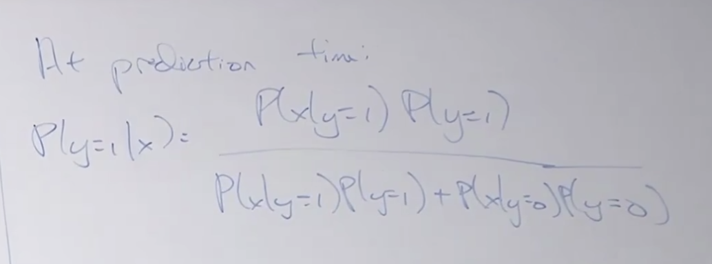 p(x|y) y일 때 x가 (정규분포에서) 나타날 확률과 p(y) 전체 y(스펨 or 정상) 메일이 (0 또는 1이므로 베르누이 분포에서) 나타날 확률을 결합하여 계산합니다.