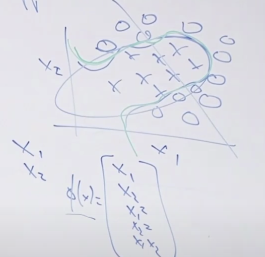 사실 입력값 x1, x2만 사용하지 말고 x1과 x2를 이용해서 다른 입력값을 만들수 있는데 (이것이 그림 하단에 있는 Φ(x)처럼 x1*x2를 한다든가, x1^2 등 새로운 값을 만들어내는 것입니다.) 이 만들어진 피처를 이용해서 로지스틱 회귀를 훈련하면 초록색과 같이 복잡한 경계도 분류할 수 있습니다. 문제는 x1, x2에서 다양한 피처 X를 만들어 내는 것이 힘든일이라는 것이지요 그리고 어떤 피처가 적합한지 알 수 없기 때문에 어려운 작업입니다.
