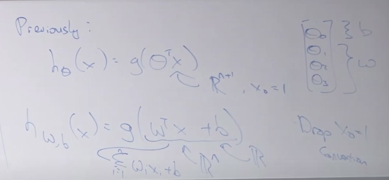 * Optimal margin classifier : 선형분리와 비슷하지만 살짝 다른 부분이 있습니다. 일단은 그냥 로지스틱 회귀와 같은 것으로 가정하겠습니다. 아래에 설명 할 예정입니다.
