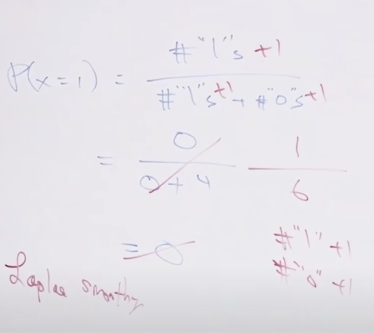 그래서 이러한 경우 우리는 라플라스 스무딩이라는 것을 할 수 있는데요. 이것은 각 경우의 수에 1을 더해주는 것입니다. 0의 갯수 4에 1을 더해주고, 1의 갯수 0에 1을 더해주어서 분모나 분자에 0을 안만드는 방법입니다.