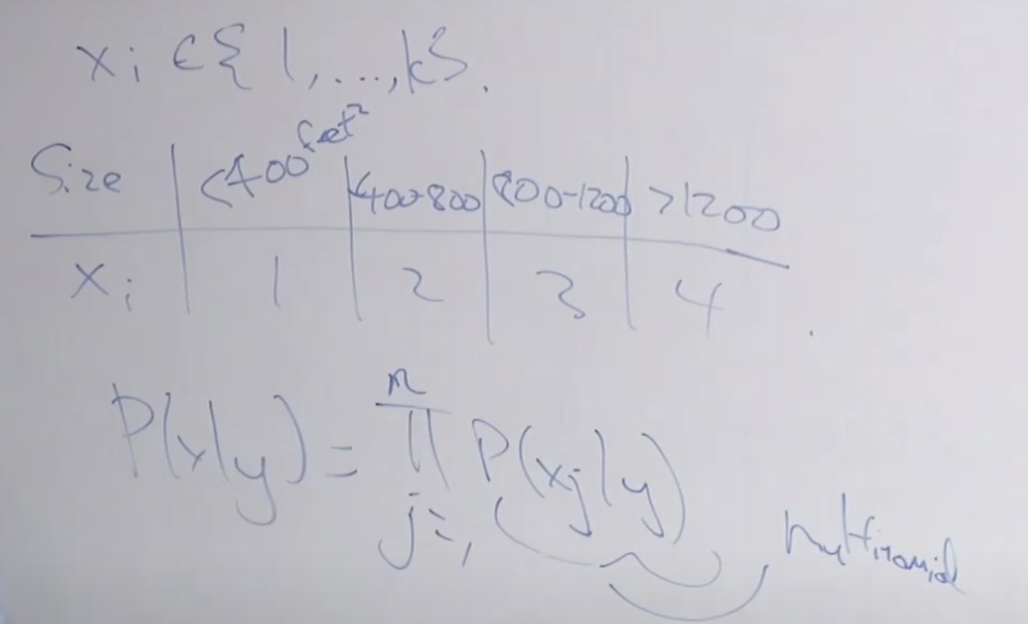 일반화된 예를 보겠습니다. 이를 위해 예전에 예시를 들었던 주택 예시를 들어보겠습니다. 주택이 30일 내에 팔릴지 안팔릴지를 판단하는 모델을 만든다고 가정합시다. 입력 데이터로 방 크기를 버켓팅(Bucketing)하여 아래과 같이 구분하여 입력합니다. 이렇게 하면 이전에 (스팸메일분류모델에서는) 베르누이 분포였지만 여기서는 다항 분포 확률이 됩니다.