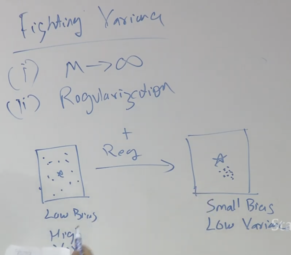 그래서 Variance를 줄이는 방법에는 여러가지가 있습니다. 먼저 훈련 데이터수를 늘리는 것입니다. 두번째는 정규화(Regularization)를 하는 것입니다. 그래서 점들을 모이게 만드는 것입니다.