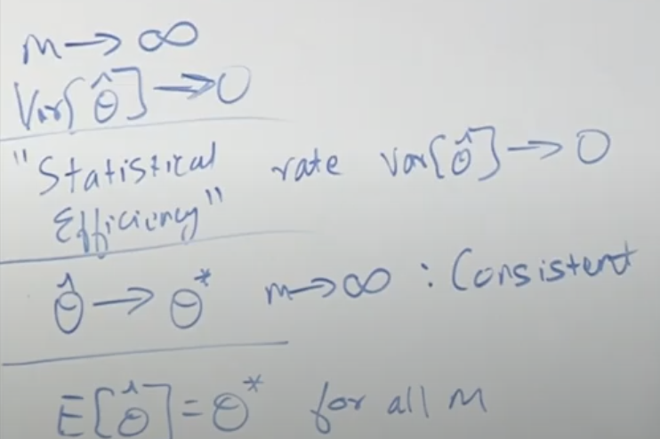 다시 말하면 훈련 데이터 수(m)가 무한대로 많아 진다면 Variance[θ^]이 0에 가까워 집니다. 그리고 훈련 데이터가 많아지면 추정값인 θ^(세타헷)이 실제값인 θ*(세타스타)에 가까워 집니다. 모든 데이터를 가지고 훈련해서 θ^을 통해 추정하면 θ*와 같은 값이 됩니다. (이론적으로 그렇다는 것이고 실제로 모든 데이터를 훈련할 수 없는게 현실이고 그리고 가능하다고 해서 그말은 모델을 만들 필요가 없다는 의미 없습니다. 그래서 위에서 말한 것처럼 같은 값으로 가까워진다는 표현이 더 좋은 것 같습니다.)
