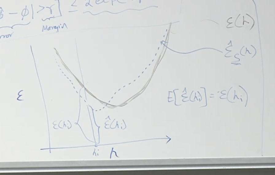 이것을 그래프로 그려보면 아래와 같습니다. 하나의 셈플로 에러를 측정한 임피리컬 에러(파란색 점선)와 정규화된 에러(E(h)) ( 검정색 실선)을 볼 수 있고, hi라는 특정 샘플(hi)에서 두선의 에러 차이를 보면 아래와 같이 표시될 수 있습니다. 이러한 임피리컬 에러들을 정규화 에러선으로 변환시키는 방법중 하나가 Uniform Convergence 균등수렴 방법입니다.