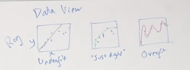 Data view에서 바라본 Bias / Variance는 지난 시간에 봤던 것과 같이 아래 그림과 같습니다. 3개의 모델이 있다고 가정한 것이고 Underfit, Just Right, Overfit 된 모델을 선으로 그린 그림입니다.