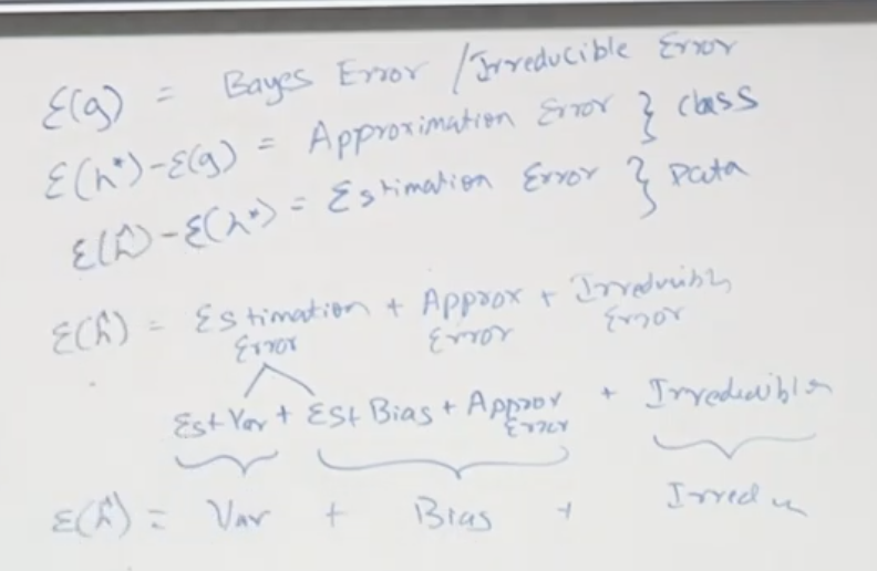 ℇ(g) 는 Bayes Error 또는 제거가 불가능한 에러(Irreducible Error)라고 불립니다. 훈련데이터에서 다른 x 값에 같은 y 값을 갖는 경우가 그예입니다. Approximation Error, Estimation Error, Irreducible Error 등을 알수 있습니다.