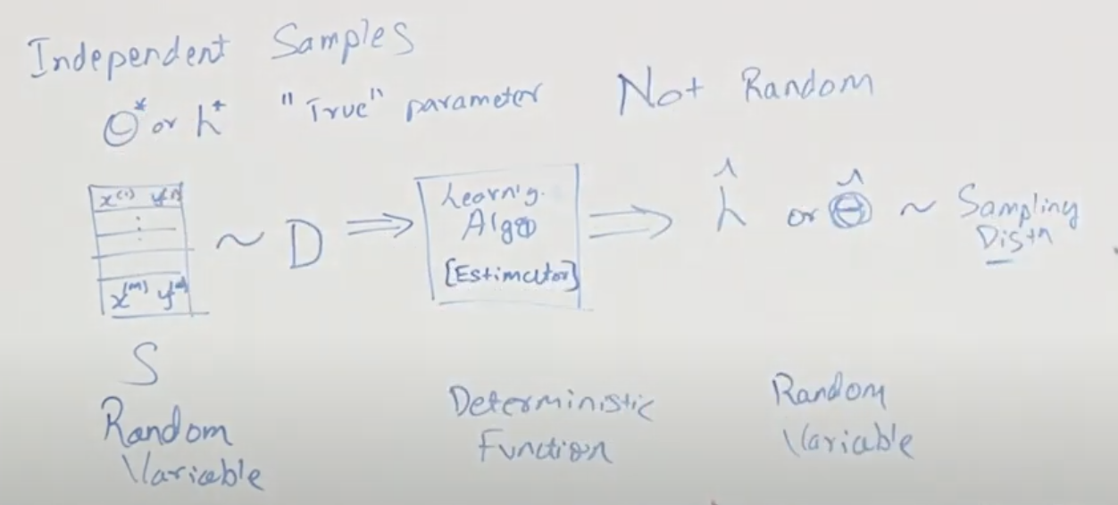 데이터들은 특정분포를 갖지만 어떤 값이 들어올지는 모르는 랜덤 변수이고 이를 학습 알고리즘(Estimator)에서 받아서 학습된 추정치인 h^ 또는 θ^을 만들어 냅니다.