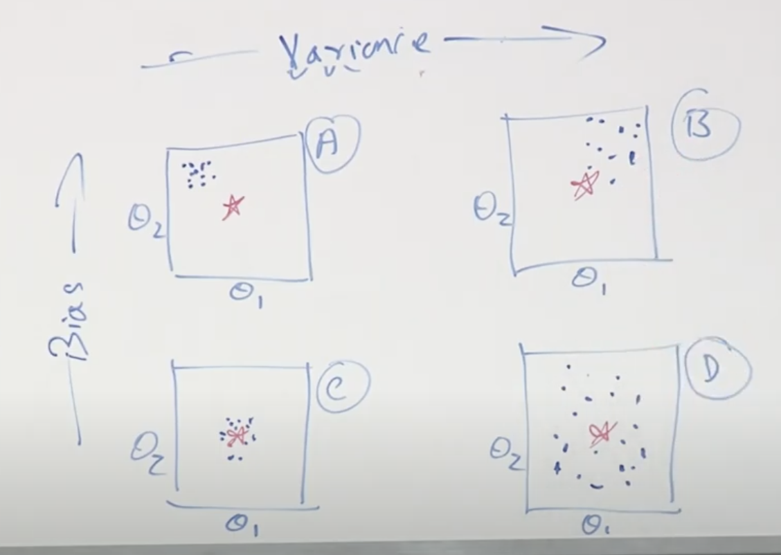 파라메타 관점에서 바라본 Bias/Variance는 아래 그림과 같습니다. 왼쪽 그래프 A, C는 낮은 Variance를 가지고 있으며(점들이 모여있습니다.), 오른쪽의 B, D는 높은 Variance를 가지고 있습니다(점들이 왼쪽보다 퍼져있습니다). 위의 A, B 그래프는 높은 Bias를 가지고 있으며(중앙의 별과 점들의 중앙이 멀리 있습니다.), 아래 C, D는 낮은 Bias를 가지고 있습니다(별과 점들의 중앙이 가까이 있습니다). 가운데 별은 정답(영역) 입니다. 그래프의 점들은 한번 훈련이 됬을때의 θ1, θ2의 값에 의해 그려진 것입니다.