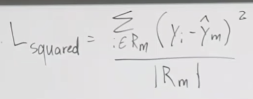 지역 Rm에 해당하는 예측값 y^m을 수식으로 나타내면 아래와 같습니다. 이것은 지역 Rm에 있는 모든 수의 합을 숫자 갯수로 나누어서 계산하는 값으로 결국 지역의 평균 값이 됩니다.
