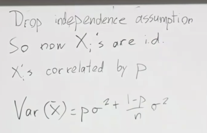 여기서 독립 가정을 제거하면 전체 모집단의 평균(X-bar)에 대한 분산은 아래와 같이 계산할 수 있습니다. 공식을 풀어서 이해해 보면 p 에 의해 연관된 x 샘플이 많을 수록 분산은 커지고 데이터수(n) 이 클수록 분산이 작아지게 됩니다.