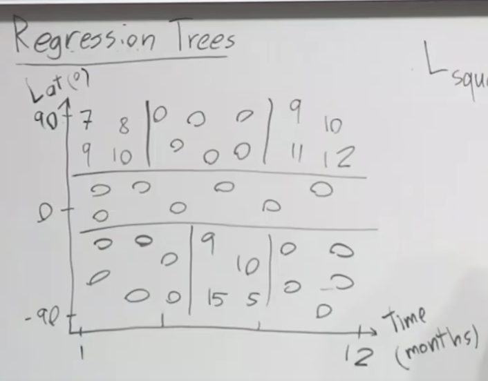 이번에는 Regression Trees에 대해서 알아보도록 하겠습니다. Decision Trees의 예로 사용했던 스키 예를 이용하겠습니다. 다만 적합한지 아닌지 + - 로 구분했던 것을 적설량으로 구분하는 예를 들어보겠습니다. Decision Tree에서와 같이 위도와 시간 월에 따른 위치에 적설량을 숫자로 표시합니다. 그리고 이것을 잘 분류하게 됬을 경우 아래처럼 구분하는 선들이 그려지게 됩니다.