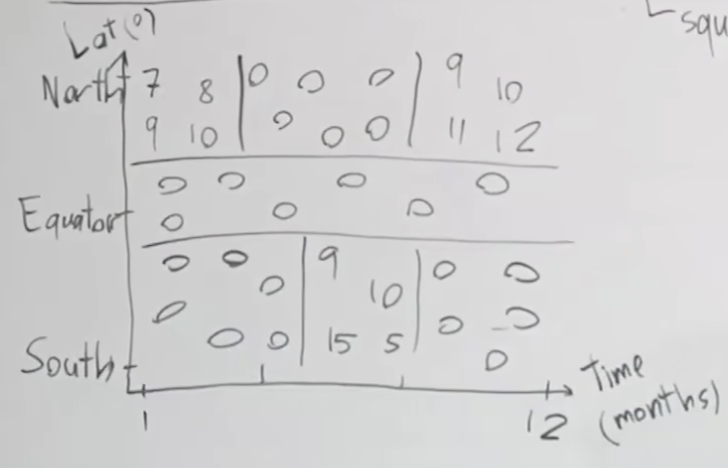 첫번째는 위도가 30도 인지를 가지고 분류할 수 있습니다. 그래서 위도가 30보다 큰 지역과 작은 지역으로 나누어 집니다. 이어서 두번째로는 시간(월)을 가지고 분류할 수 있습니다. 3월보다 작은 달인지 아니닌지로 구분합니다. 이렇게 나누어진 그림이 아래와 같습니다.