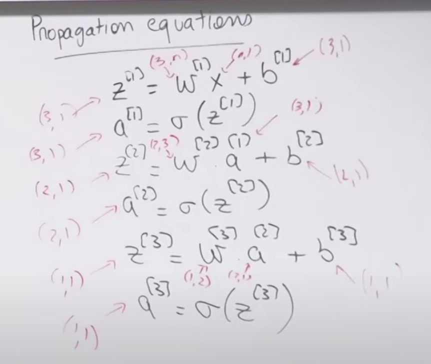 다시 이미지에 고양이가 있는지 없는지를 구분하는 첫번째 문제를 생각해 보겠습니다. 로지스틱 회귀의 신경망 버전에서와 달리 중간에 히든 레이어를 추가할 수 있습니다. 이것은 입력과 출력에서 보이지 않는 신경망 계층을 의미합니다. 신경망의 첫번째 레이어는 단수한 엣지 같은 것을 식별해내고 두번째 레이어에서는 귀나 입 같이 좀더 복잡한 모양을 찾아냅니다. 이처럼 신경망의 깊이가 깊어질 수록 보다 복잡한 구조를 이해하게 됩니다. 파라메터의 갯수는 첫번째 레이어에서 3n + 3, 두번째 2 * 3 + 2, 세번째 2 * 1 +1 개가 됩니다.