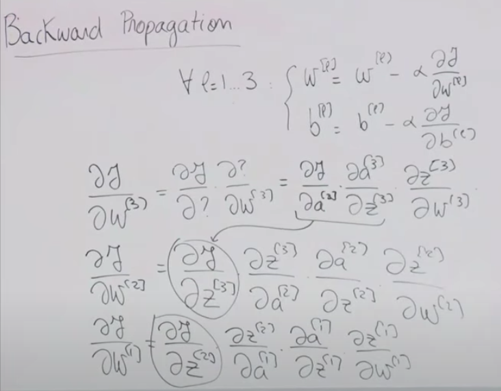 Loss 함수를 편미분한 만큼씩 W와 B의 값을 수정해주는 것이 필요합니다. 이것을 모든 레이어 별로 실행해 줘야 합니다. 이때 시작하는 포인트가 Level 3 즉, w3 부터 미분해줍니다. 이렇게 하면 이후에 계산할 w2에서 앞서 계산한 값을 이용할 수 있기 때문에 계산이 쉬워집니다. 그래서 네트워크의 출력단 즉, 뒤에서 부터 계산하게 되는 것이지요.