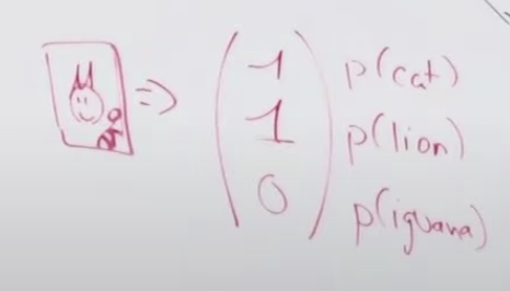 그럼 이 모델은 여러 개의 동물이 있는 이미지에도 잘 분류할까요? 만약, 고양이와 사자가 들어있는 이미지를 모델에게 준다면 모델은 고양이도 잇고 사자도 있다고 판단할 것입니다. 아래 그림처럼 아웃풋 벡터에서 고양이와 사자에 해당하는 위치의 값이 1로 나올 것 입니다.
