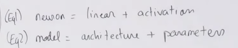 두가지 기억하고 있어야 할 것이 있습니다. 첫째, 뉴런은 리니어 파트와 엑티베이션 파트로 구성된다는 것 입니다. 위의 그림에서 wx + b 부분이 리니어 파트이고 시그마 부분이 엑티베이션 파트 입니다. 동그라미가 바로 뉴런 입니다. 두번째, 모델은 아키텍처와 파라메터라는 것 입니다. 실무에서 모델을 만들어 배포했다는 것은 모델 아키텍처파일과 파라메터 파일을 배포했다는 것이고 이 두 파일을 이용해서 예측을 계산 / 실행하게 됩니다.