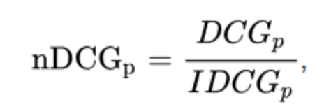 nDCG는 랭킹 시스템의 학습을 평가하기위해 가장 많이 사용되는 평가지표 입니다. 이전의 평가 지표들과는 달리 nDCG는 문서의 순서와 관련성의 중요성을 고려한 지표입니다. 즉, 추천 리스트의 위쪽에 관련성이 높은 문서가 위치할 수록 높은 값을 갖습니다.