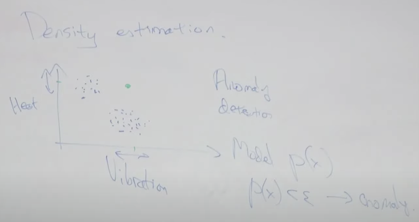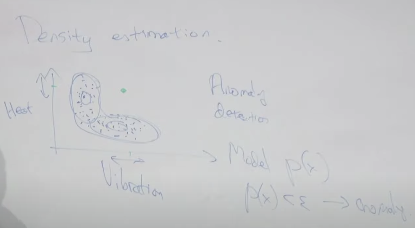비행기 엔진을 만드는 공장에서 만들어진 엔진의 불량을 탐지하는 모델을 만든다고 생각해 보시죠. 시험 테스트 중에 나온 데이터인 진동 Vibration과 발열 Heat을 가지고 그래프를 만들었을 때 아래와 같이 그려진다고 하겠습니다. 이 때 녹색 점과 같은 데이터를 만들어낸 비행기 엔진의 경우 이상 탐지(Anomaly Detection)으로 탐지 할 수 있습니다.