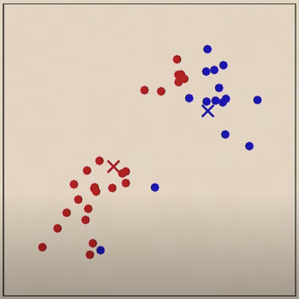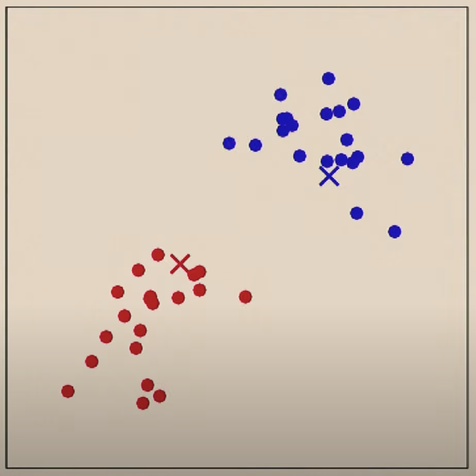 데이터 별로 두개의 중심점 중에서 어느 중심점에 더 가까운지를 기준으로 클러스터(색)를 정합니다.