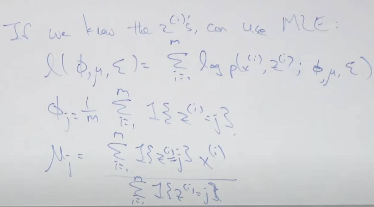 만약 우리가 z(i)의 값들을 알고 있다면 MLE를 사용할 수 있습니다. 그때 가능도는 아래와 같이 구할 수 있습니다.