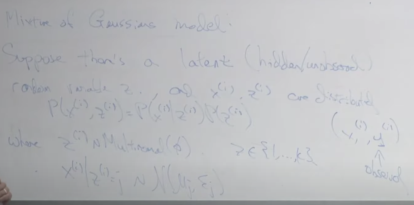 latent 는 hidden 또는 unobserved의 의미 입니다. z는 랜덤 변수값이고 다중 분포일때 z ㅌ {1, ... k} , x(i), z(i)는 결합 분포를 가지고 있습니다. 이 것은 P(x(i), z(i)) = P(x(i) | z(i)) P(z(i)) 로 계산됩니다.