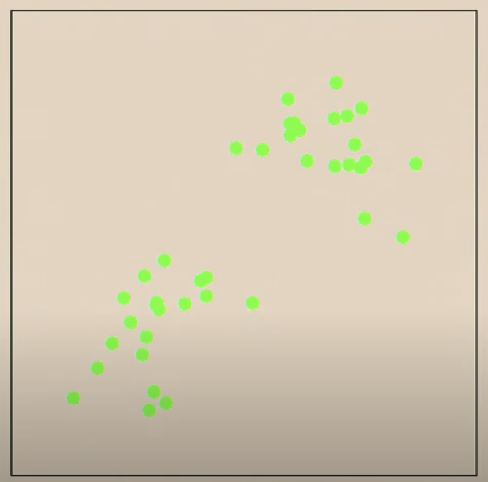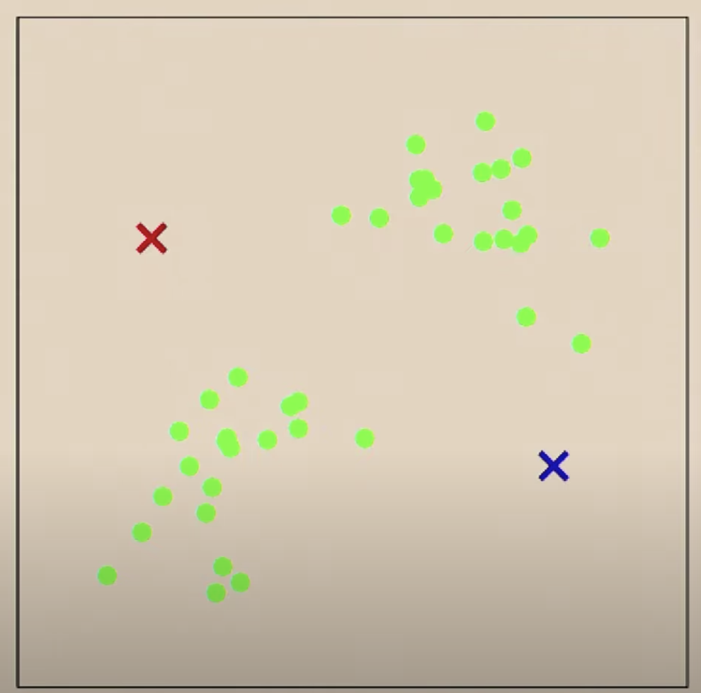 위와 같은 데이터 셋이 제공되면 2개의 그룹으로 클러스터링 하기를 원할 것입니다. k-means의 경우 임의로 클러스터 갯수에 해당하는 위치를 선정하고
