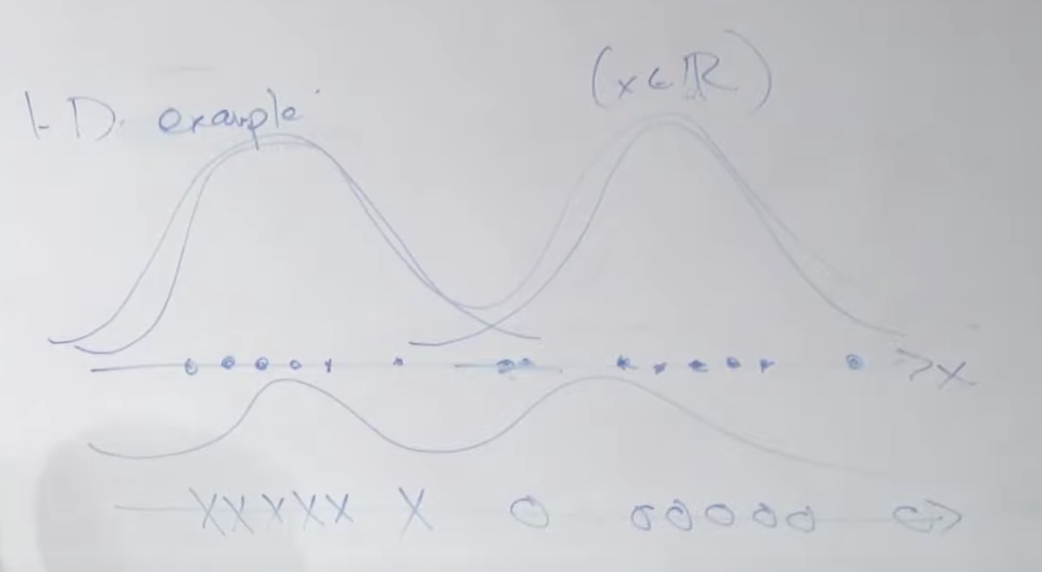 1차원 가우시안 분포를 예를 들어 보겠습니다. 아래와 같이 X 데이터가 주어졌을 때 이것은 2개의 가우시안 분포에서 왔을 수 있습니다. 그리고 이번 예시의 경우 두 개의 분포를 연결하면 중앙 부분은 확률이 낮아지는 부분으로 구성된 하나의 분포 곡선을 그릴 수 있습니다. (아래쪽 쌍봉 곡선)