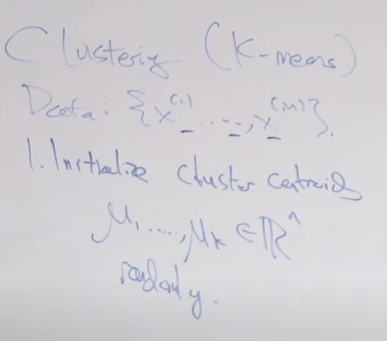 비지도 학습은 이전까지 배웠던 지도학습과 다른 학습 방법입니다. 예를 들면 지도학습은 긍정 데이터와 부정 데이터들이 주어지고 이들을 잘 분류하는 선형 회귀 모델 같은 것을 만들어서 잘 분류하는 회귀선을 만드는 것이었습니다. 그러나 비지도 학습은 레이블이 없는 데이터들이 주어지고, 지도학습에서는 (x, y)가 주어졌지만 비지도 학습에서는 x 만 제공됩니다. 이런 데이터 셋은 {x(1), x(2), ....x(m)} 으로 주어진 x 데이터 m개를 표현할 수 있습니다.
