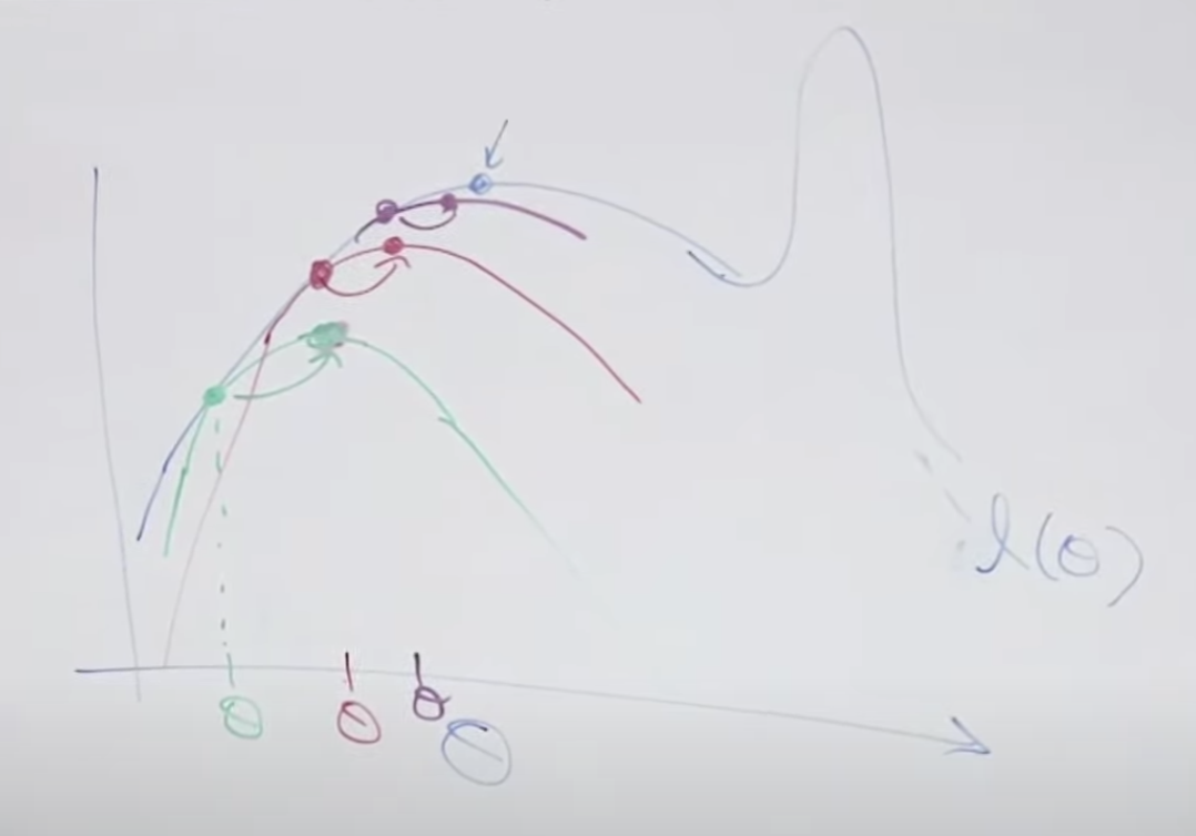 임의의 녹색 theta세타 값을 먼저 설정합니다. 이 값에 해당하는 함수곡선(녹색)을 만들고 이 함수와 목표 함수(검정색)가 만나는 점을 찾고 이 녹색 함수의 꼭지점을 찾습니다. 그리고 이 꼭지점으로 이동합니다. 이 꼭지점에 해당하는 theta값으로 변경 후 다시 함수를 찾습니다. 이러한 내용을 반복하면 검정색의 목표 함수의 지역 최대값(꼭지점)에 점점 가깝게 됩니다. 그러나 아래 그림의 오른쪽 처럼 목표함수가 여러개의 지역 최대값을 가지고 있는 경우 전체 최대값을 찾지 못할 수도 있습니다.