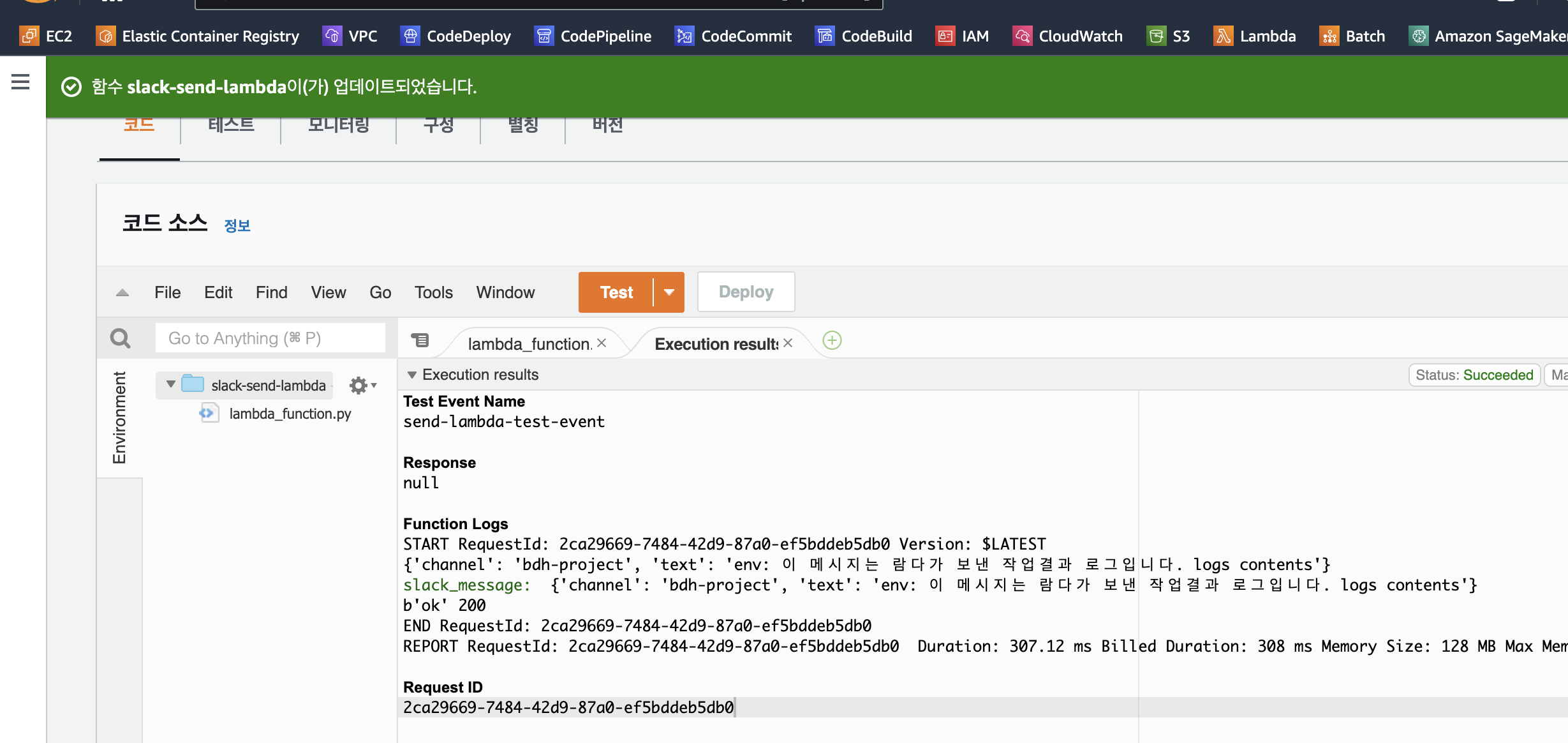 저장후 테스트 버튼을 클릭하여 테스트 이벤트를 실행합니다. 문제 없이 진행되었다면 해당 슬랙 채널에 메시지가 전송되고 람다 관리콘솔에서는 아래과 같이 성공 메시지를 볼 수 있습니다.