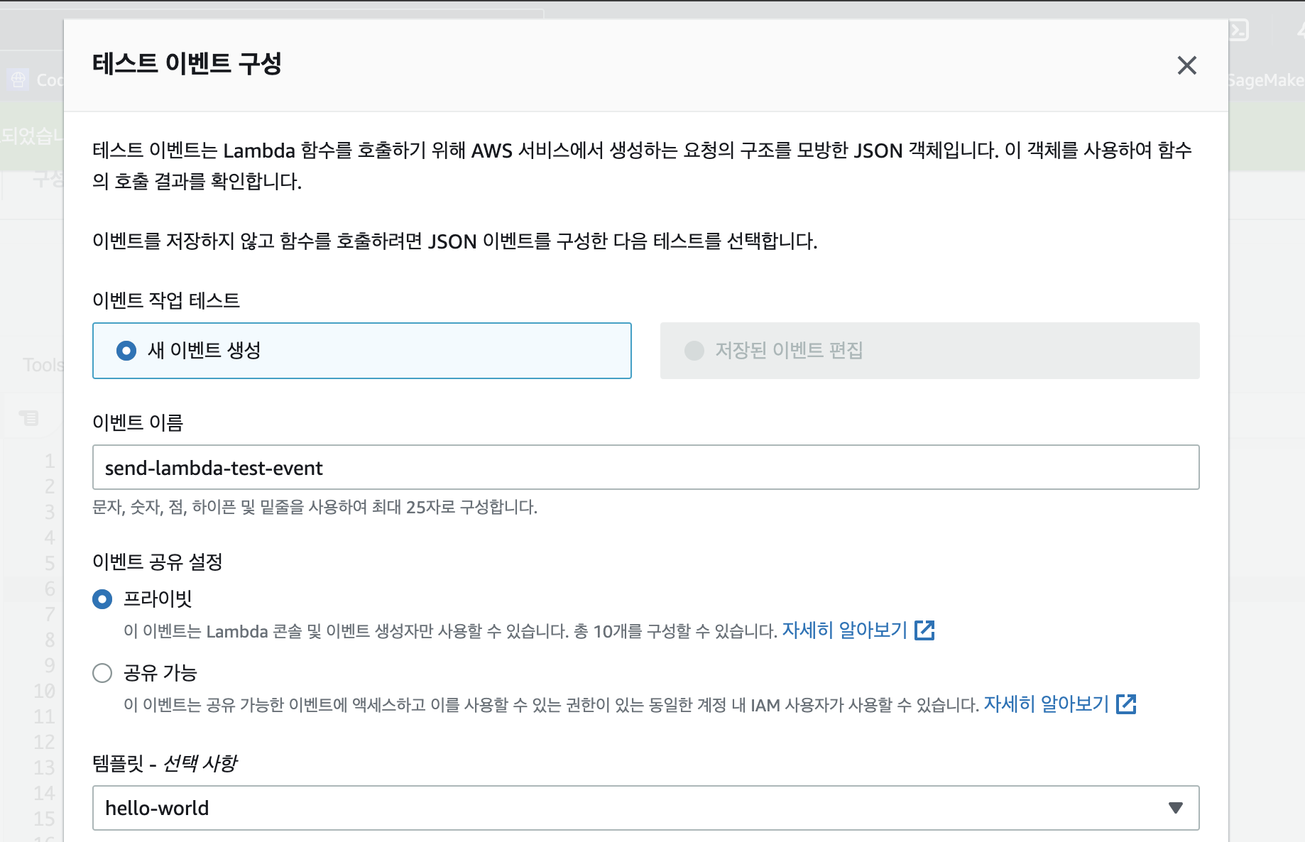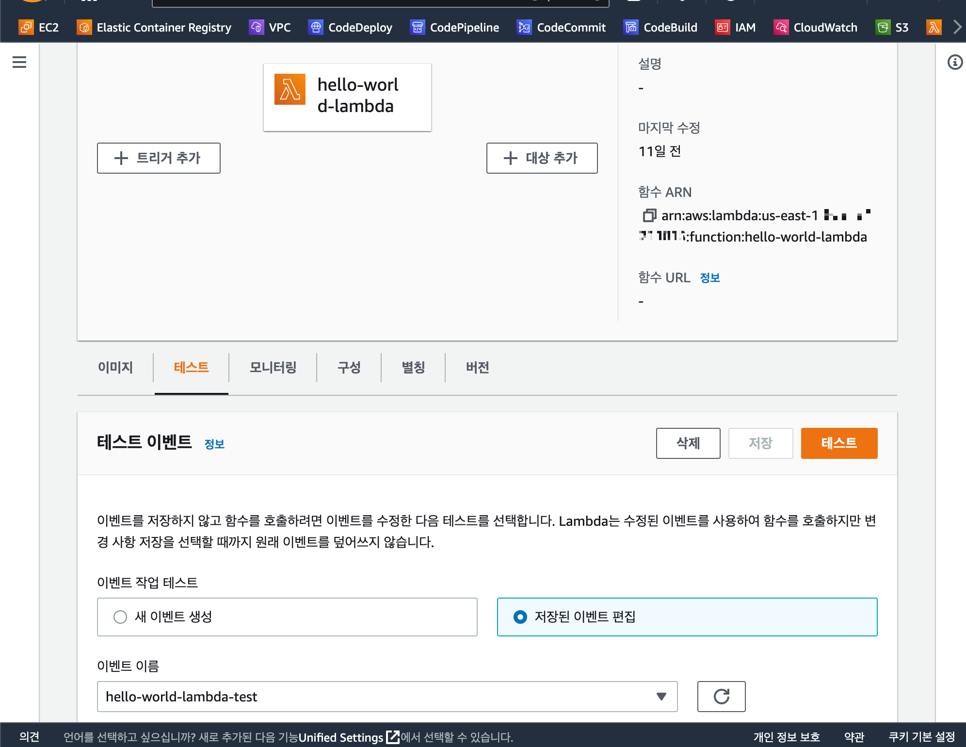 이제 마지막으로 모든 연결이 잘 되었는지 확인을 위해 테스트를 진행합니다. 람다 서비스화면으로 이동 후 어플리케이션 람다인 hello-world-lambda 를 선택합니다. 아래와 같이 적당한 이름을 입력하고 테스트 버튼을 클릭하면 앞에서 테스트했던 슬랙 채널에 새로운 알림 메시지가 도착한 것을 확인 할 수 있습니다.