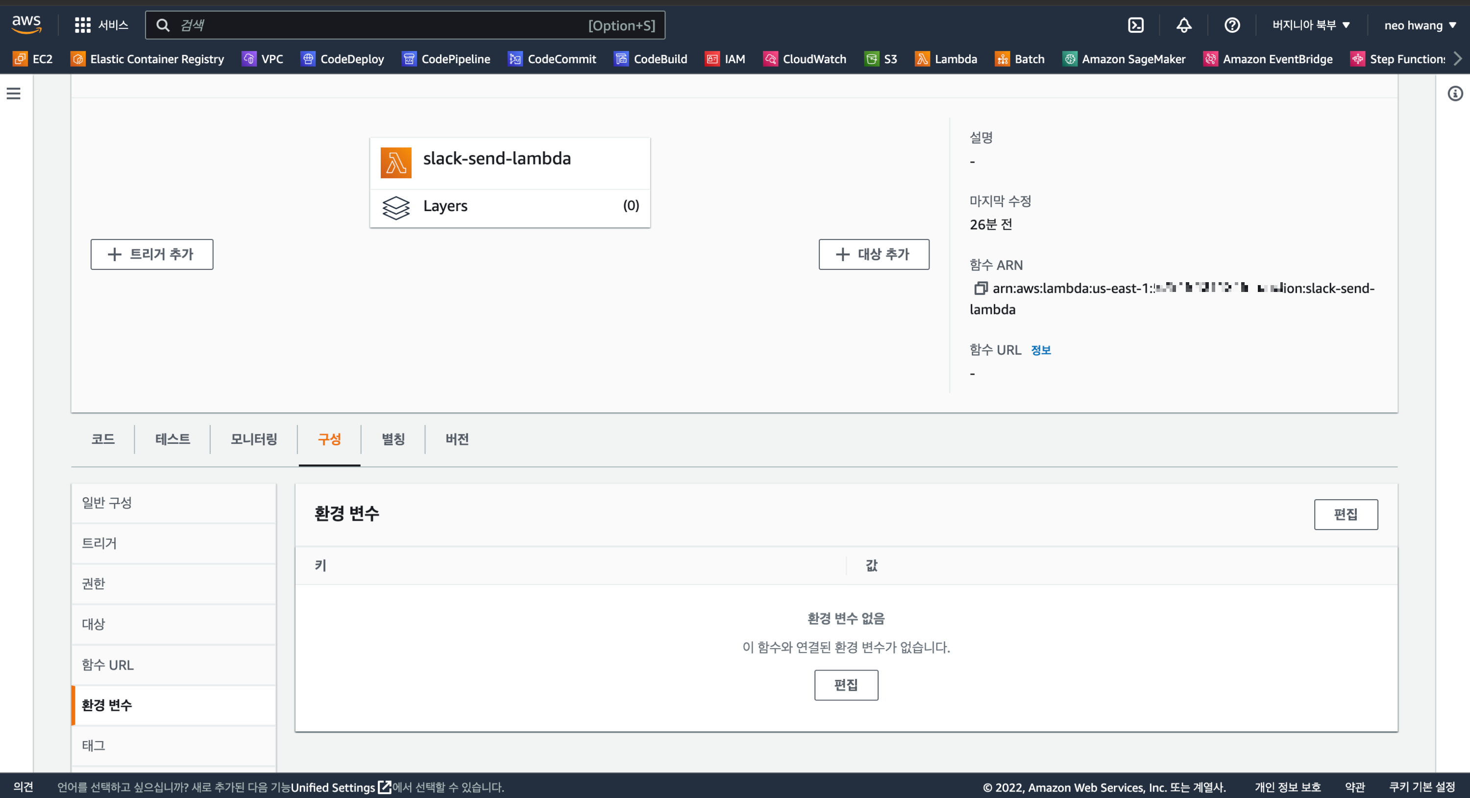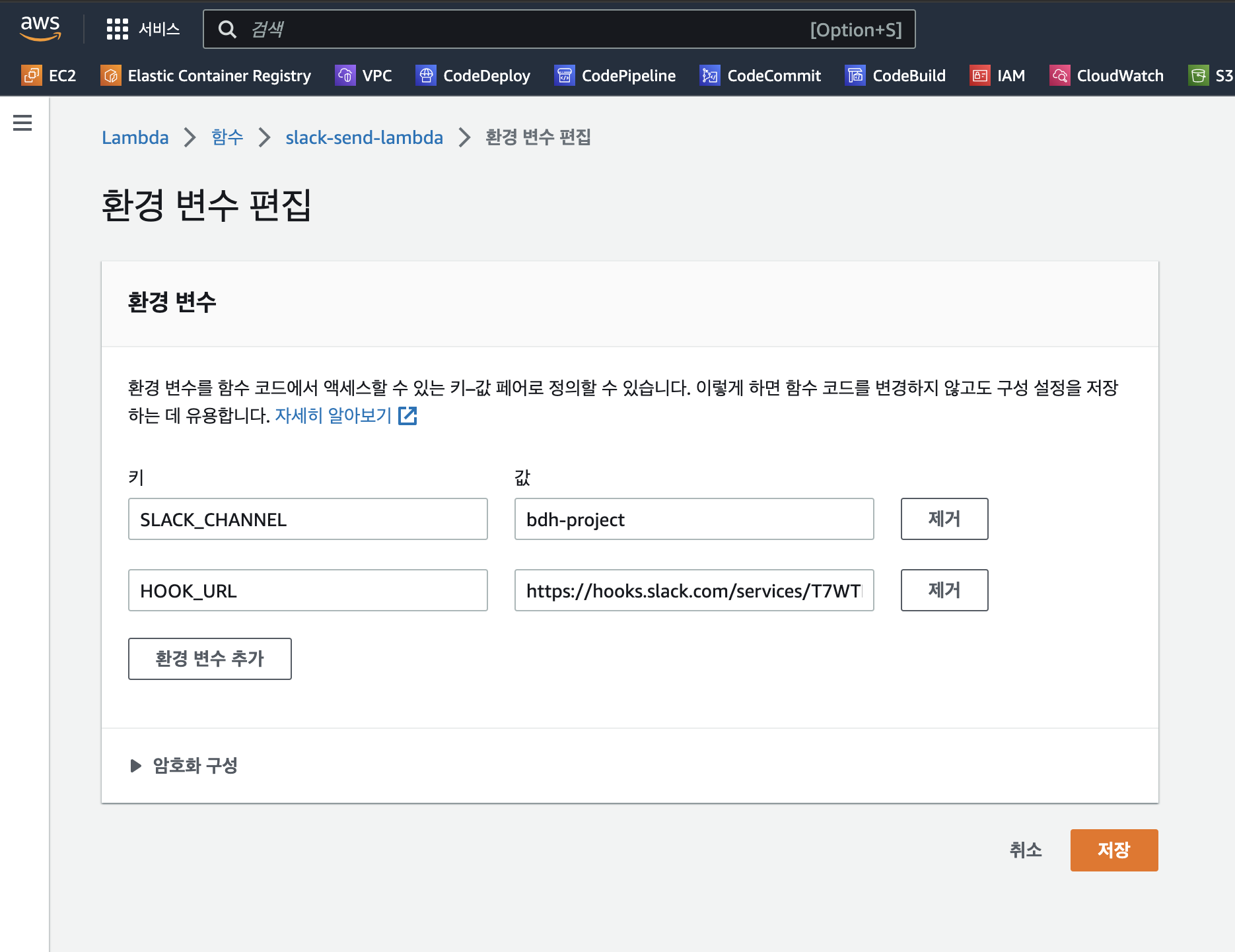 환경변수에 채널과 웹훅 주소를 설정해 줍니다. 이를 위해서 람다에서 구성 탭을 선택후 '환경 변수’를 선택하고 편집 버튼을 클릭합니다.