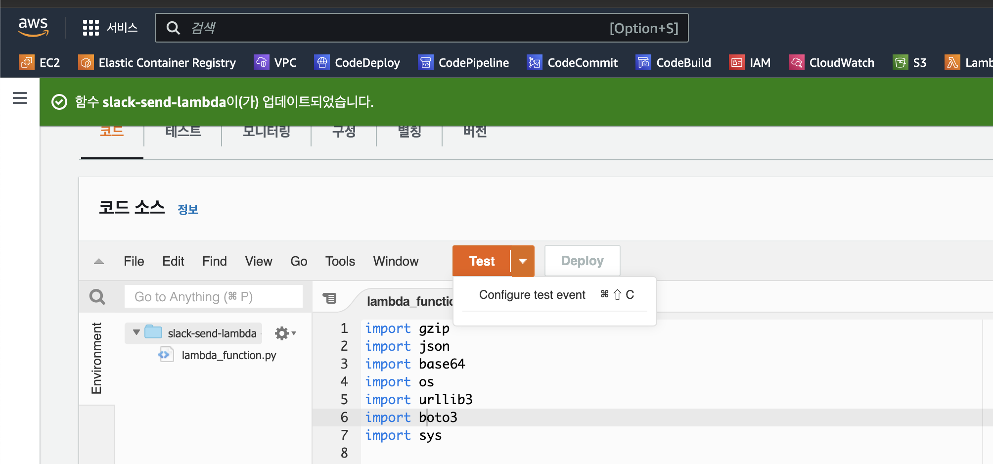 슬랙 발송 람다를 통해 슬랙 알림이 잘가는지 테스트 해 봅니다.