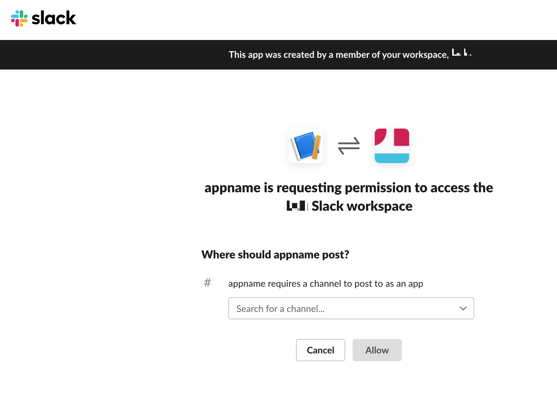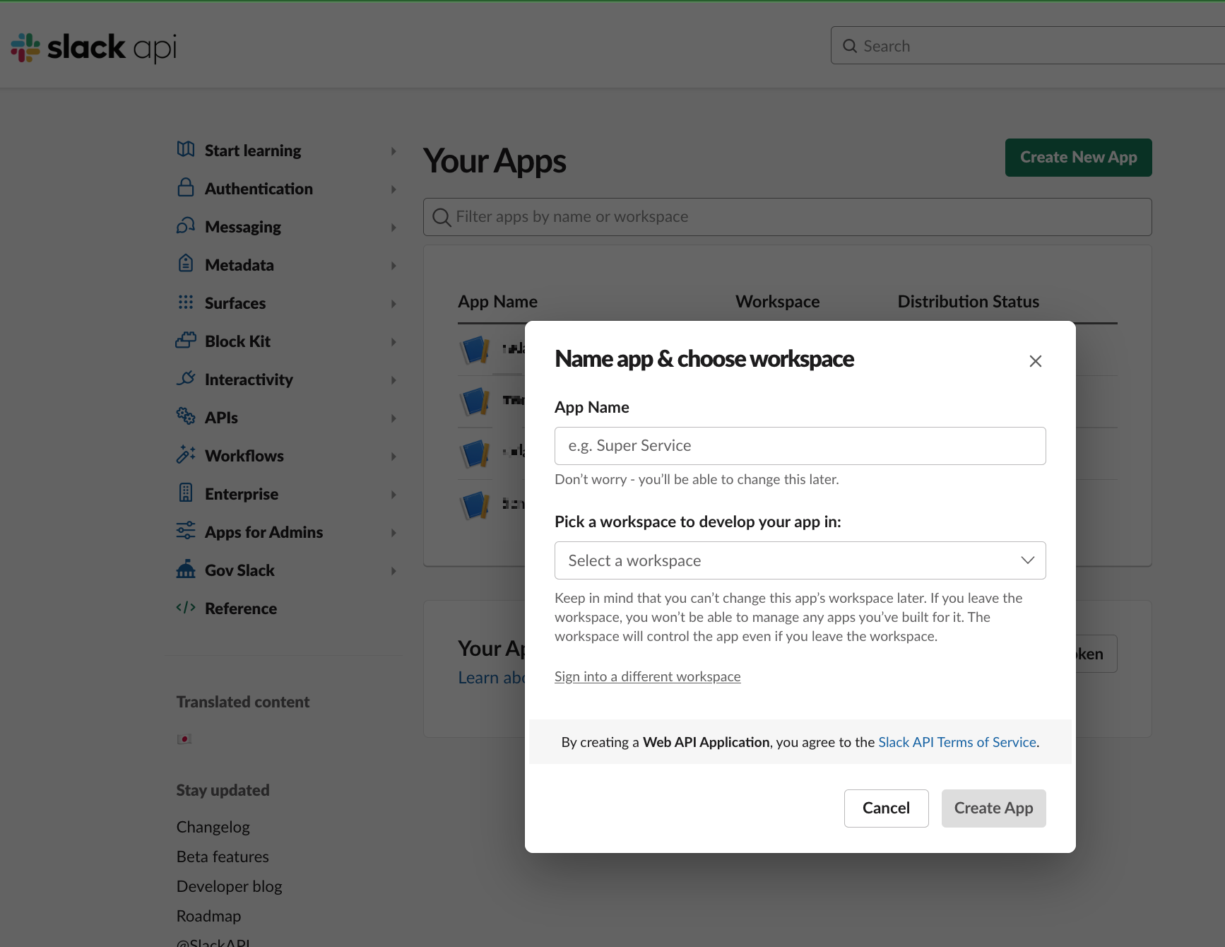 아래의 화면과 같이 뜨면 앱이름과 앱이 사용할 워크스페이스를 선택해줍니다.