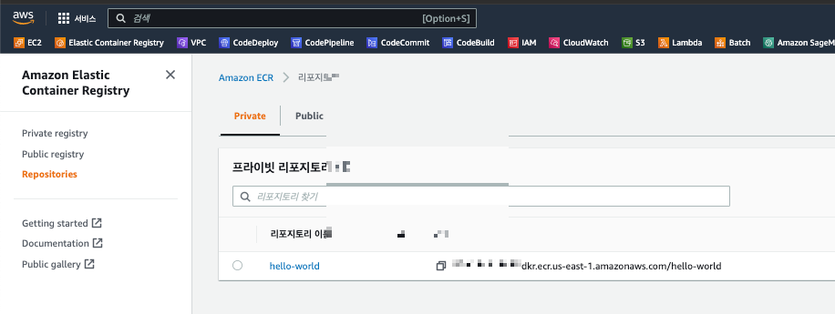 그러면 아래와 같이 ecr 관리 콘솔에서 생성된 리포지토리를 확인할 수 있습니다. 자세한 ECR 사용 상세 방법은 이전 포스팅을 참고하세요.https://bigdatamaster.tistory.com/120