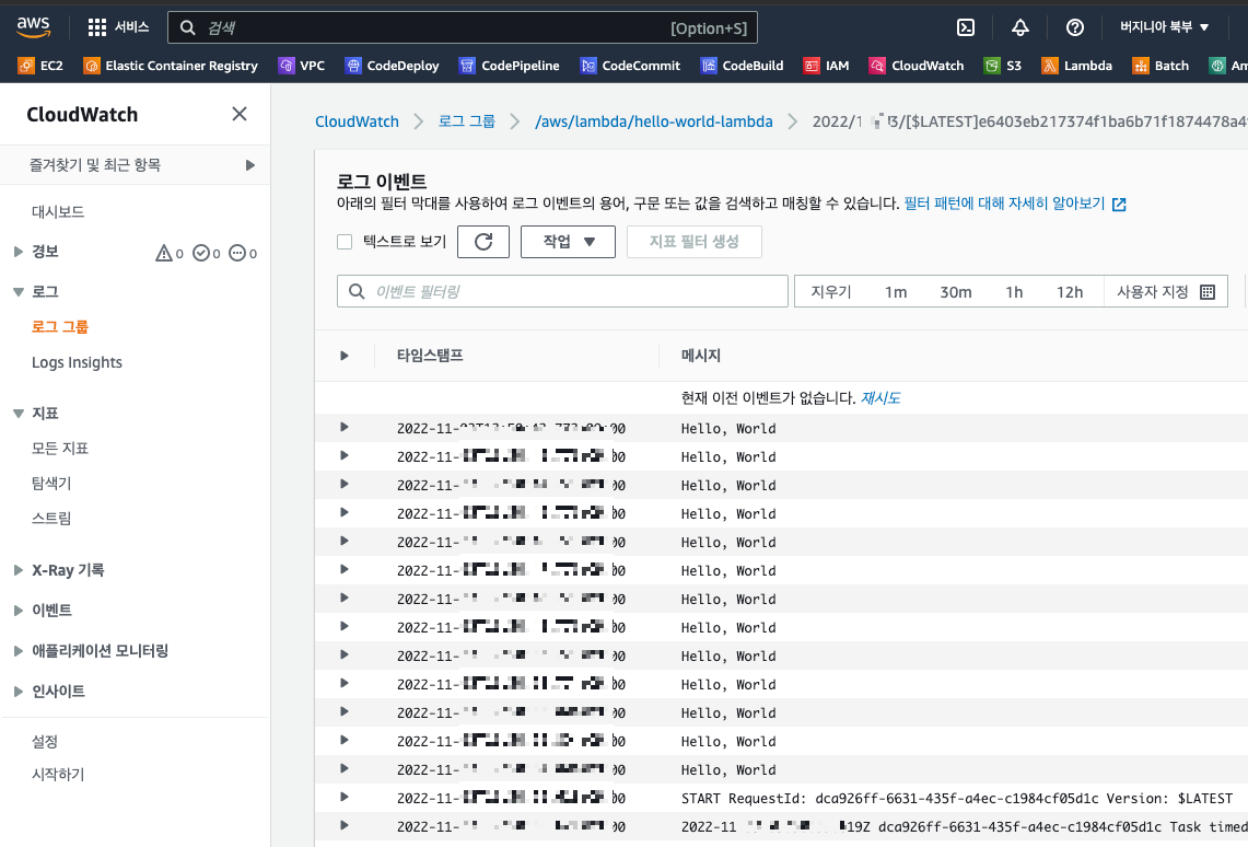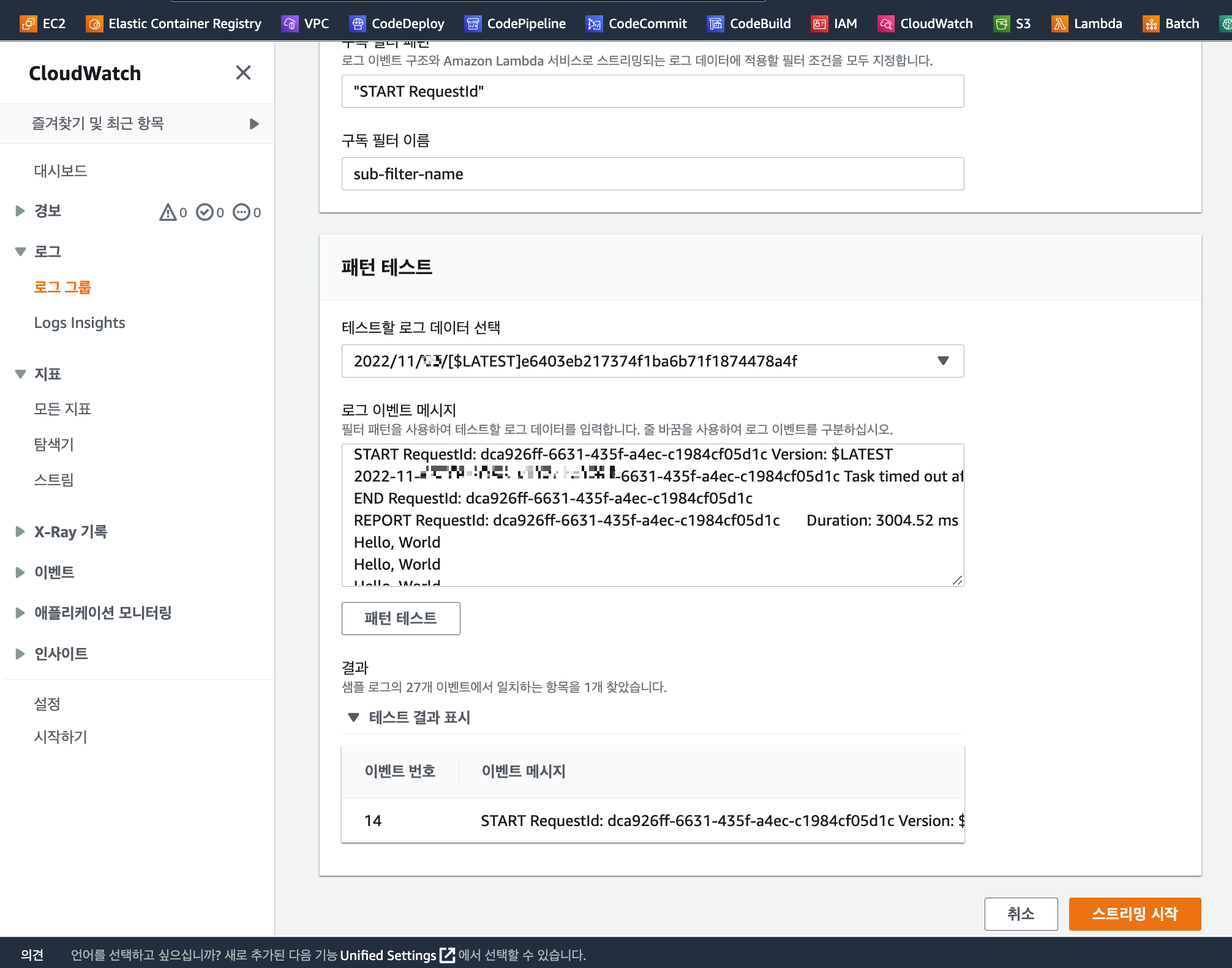 테스트 실행후 로그 보기 연결 버튼을 클릭하거나, CloudWatch 서비스 화면으로 이동후 로그 그룹 중 /aws/labmda/lambda-name 으로 생성된 로그 그룹을 선택하고, 로그 스트림 탭에서 최근 로그 스트림을 클릭하면 어플리케이션 람다 실행중에 나온 로그 정보를 확인할 수 잇습니다.
