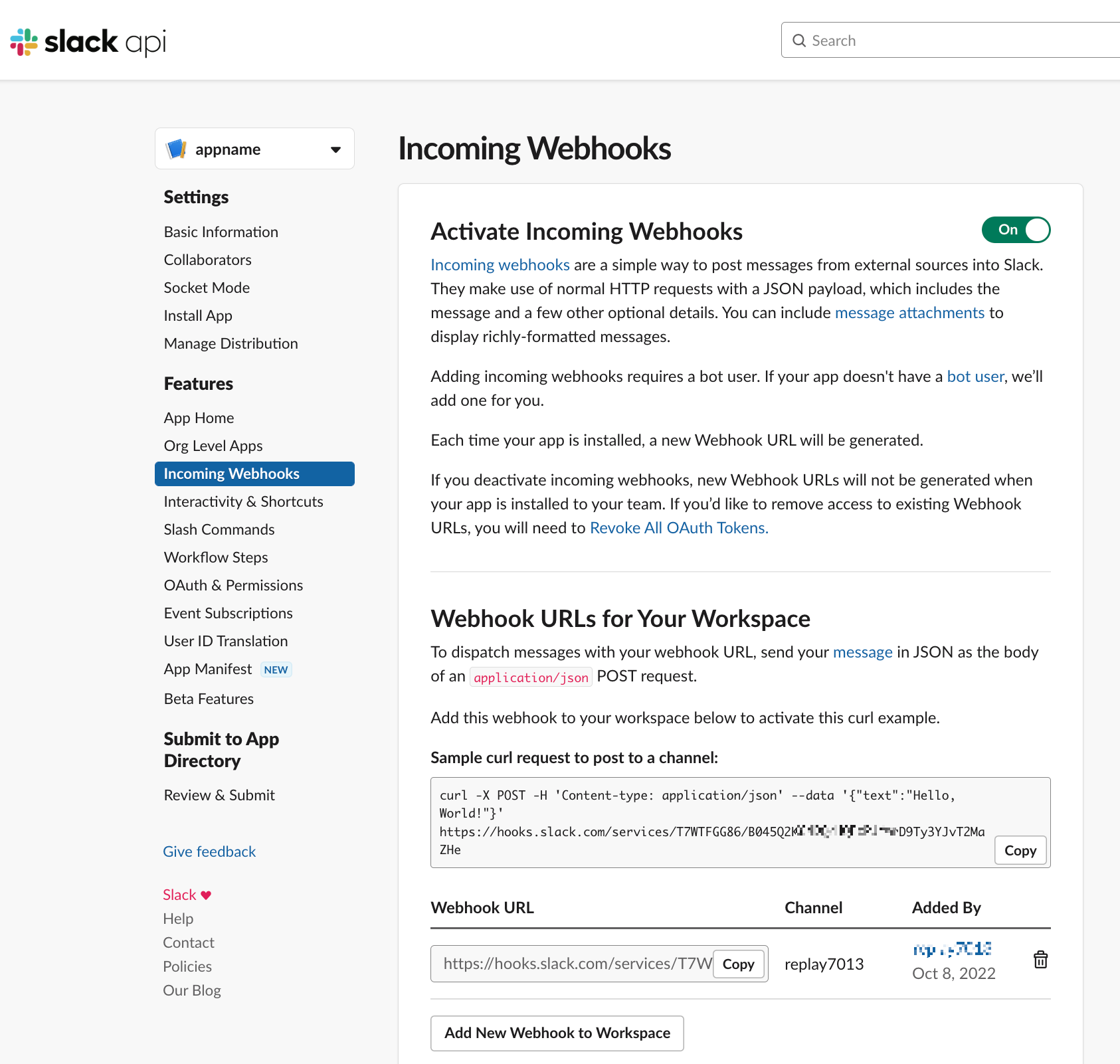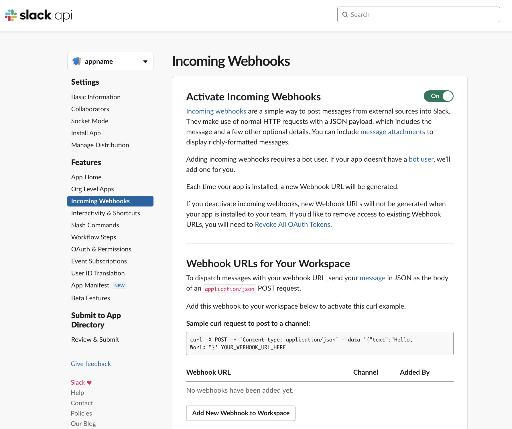 오른쪽 위에 off 를 클릭하여 On으로 바꾸어 줍니다. 그러면 아래와 같이 정보가 표시됩니다. 이제부터 앱과 워크스페이스를 연결해주는 작업을 합니다. 제일 아래의 Add New Webhook to Workspace를 클릭합니다.