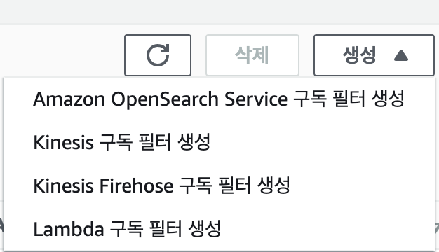 해당 로그 그룹을 선택하고 오른쪽 아래에 있는 생성 버튼을 클릭하면 아래와 같이 리스트가 나오며 리스트중에서 Lambda 구독 필터 생성을 클릭 합니다.