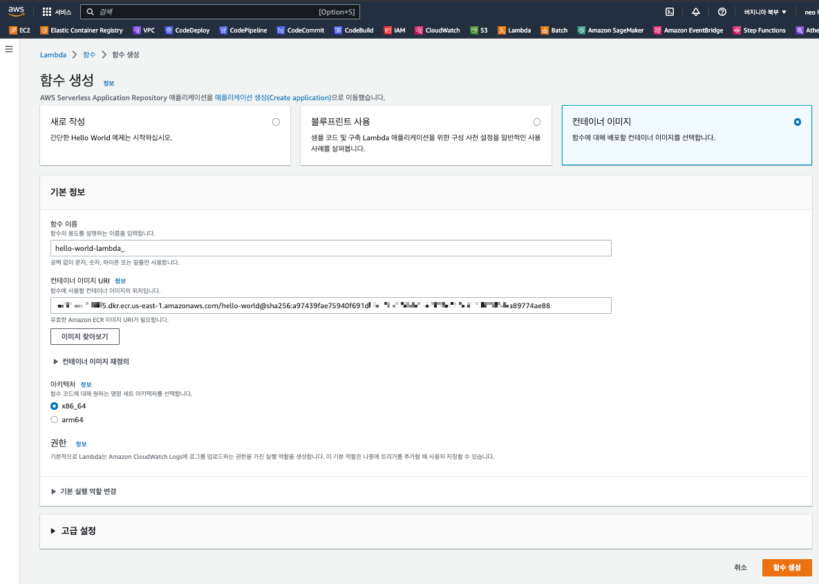 우리는 ecr의 이미지를 이용할 것이기 때문에 제일 오른쪽에 있는 컨테이너 이미지를 선택합니다. 적당한 함수이름을 넣고, 이미지 찾아보기 버튼을 이용하여 1번에서 등록한 이미지를 선택하고 함수 생성을 클릭합니다.