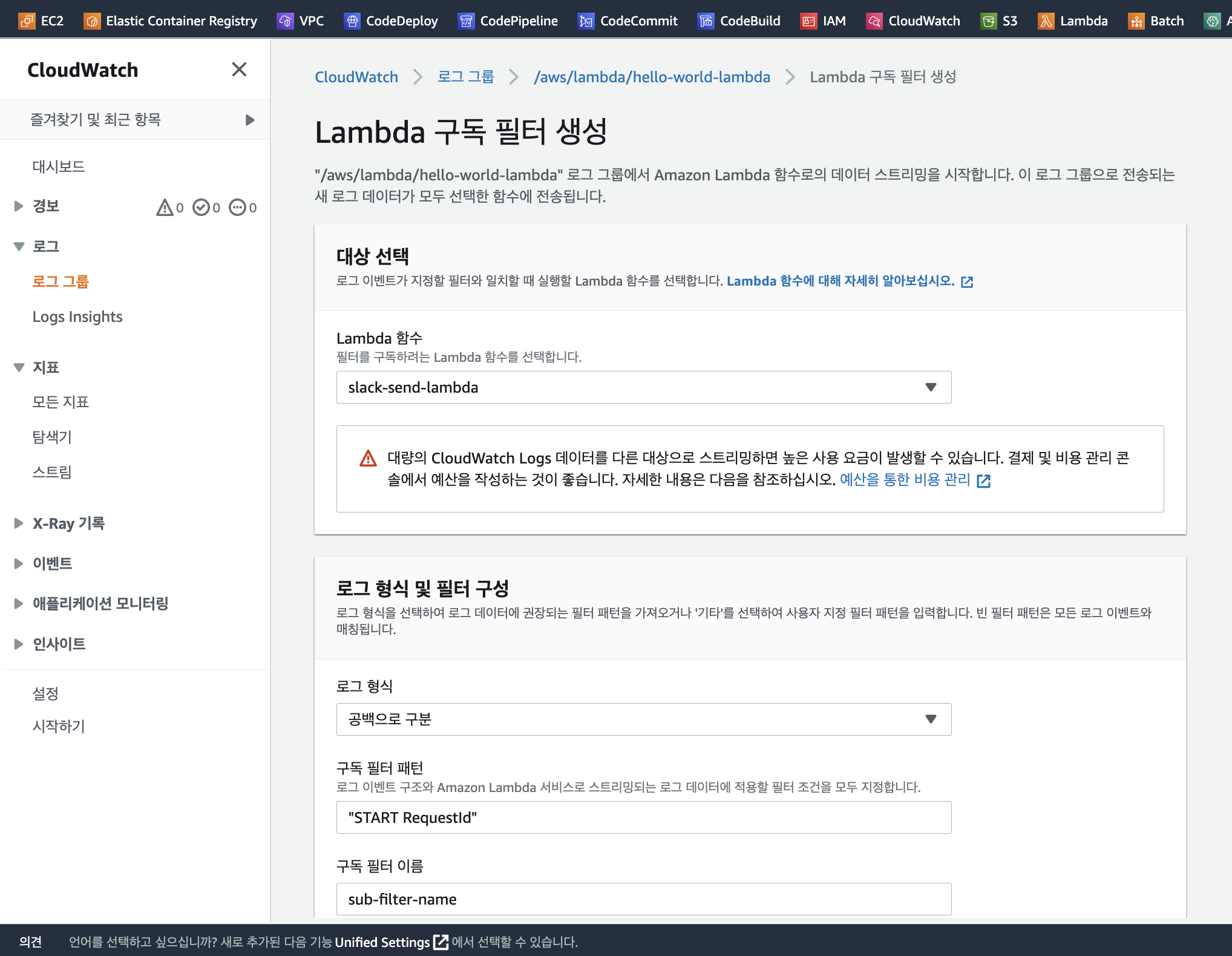 5. CloudWatch Log 필터 설정: 특정 로그가 들어오면 람다를 실행 시키도록 연결