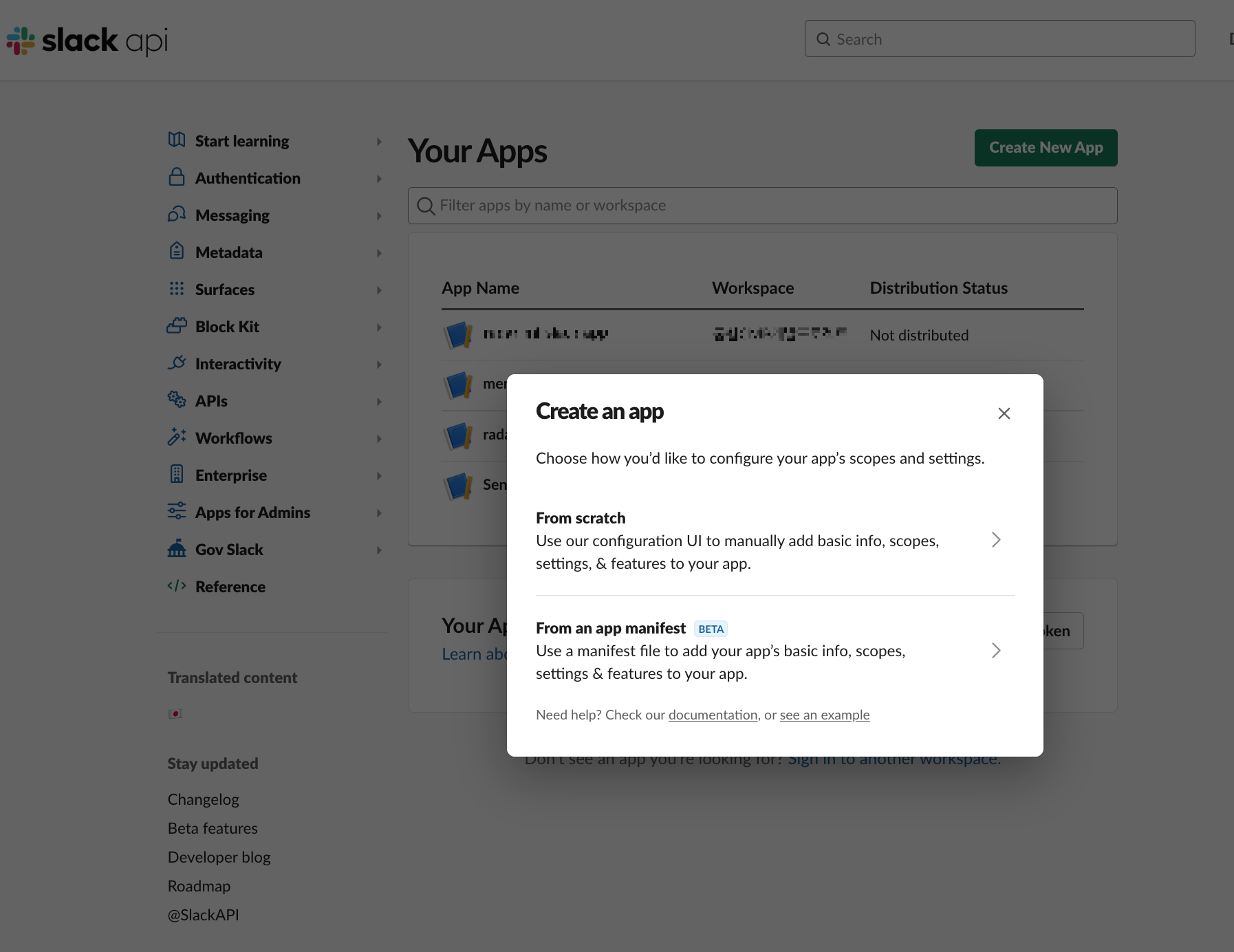 api.slack.com에 접속 후 로그인 합니다. 중앙 왼쪽에 보이는 Create an app 버튼을 클릭 합니다.